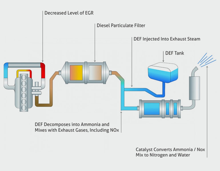 Diesel Exhaust Fluid (DEF) is one of the important solution involved in the SCR Process. It is a nontoxic - non hazardous solution. DEF helps to convert NOx into harmless nitrogen and water vapor. It is stable, colorless, odorless and meets accepted international standards for Purity and composition.